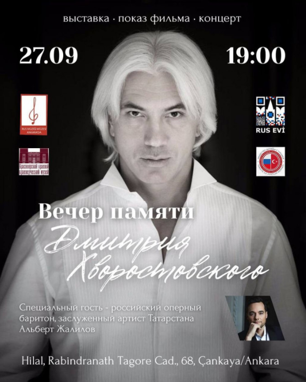 29 сентября в концертном зале Bankkart Mavi Salon состоялся большой концерт памяти Дмитрия Хворостовского. Ведущие солисты Анкарского театра оперы и балета и Альберт Жалилов исполнили песни из репертуара Дмитрия Хворостовского на русском и турецком языках.